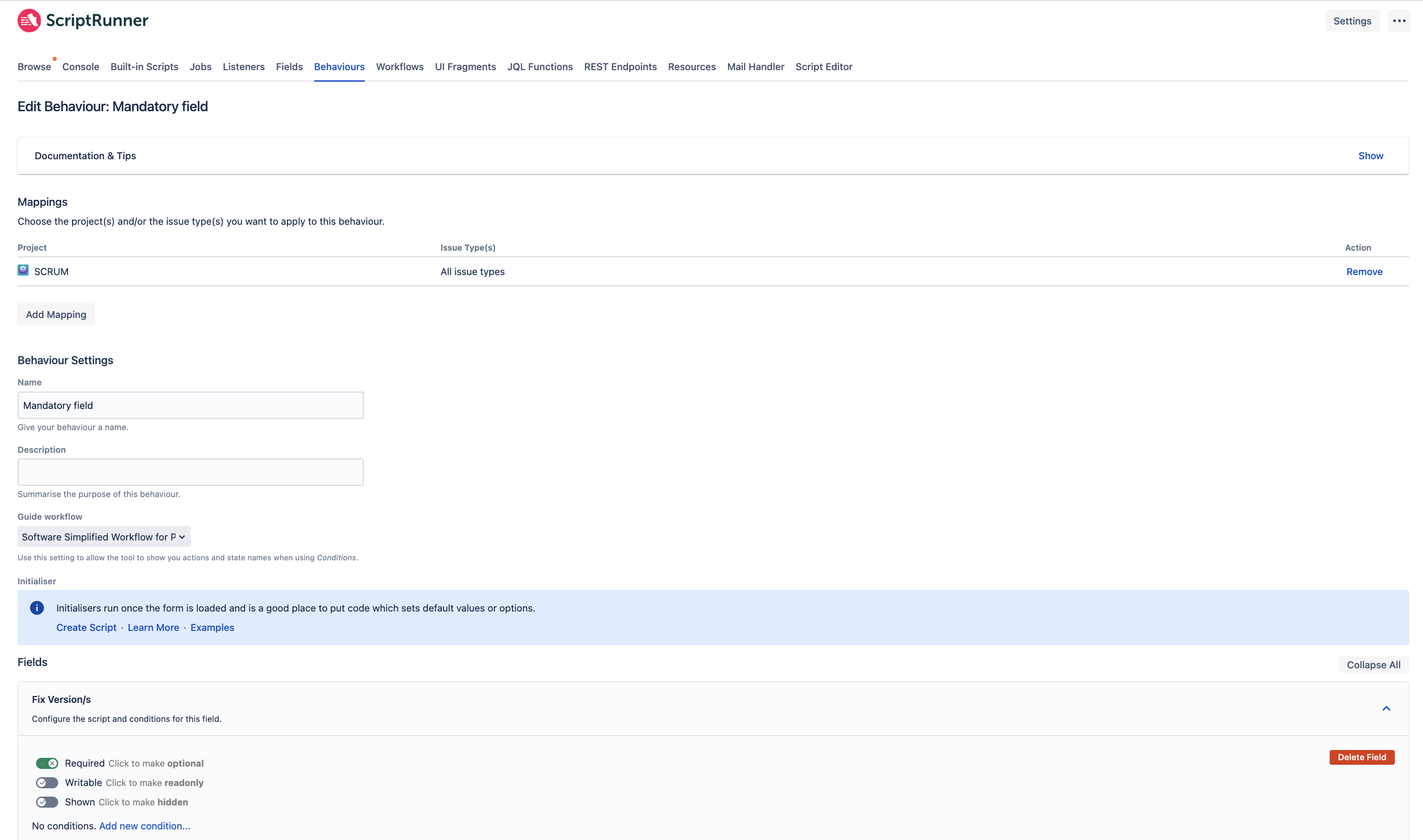The other field is set as a Mandatory field in the behaviors configuration of the ScriptRunner For Jira add-on, as illustrated below: