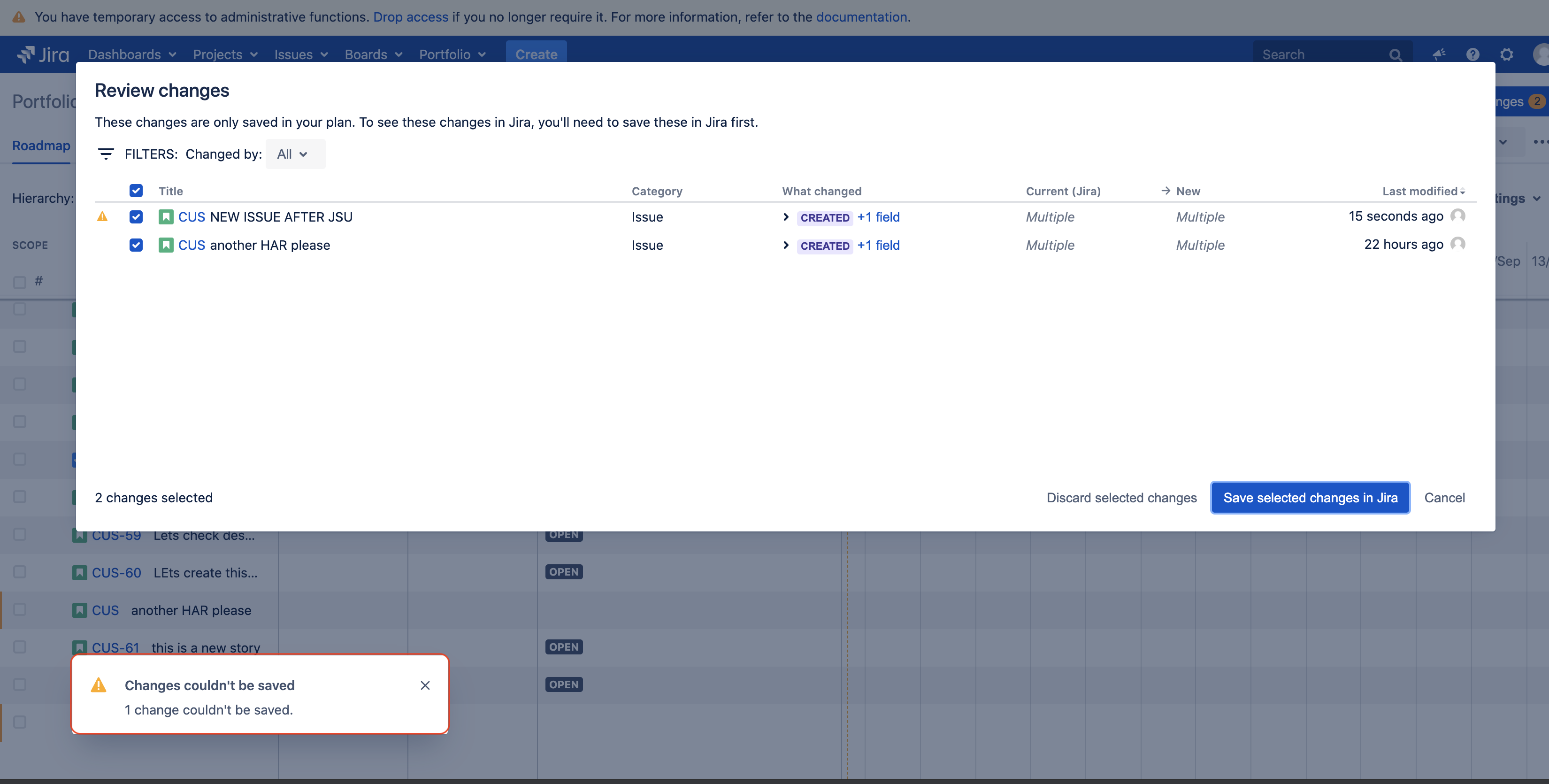 When clicking on the button Save selected changes in Jira, the action fails and the error "Changes couldn't be saved" pops up at the bottom left of the screen