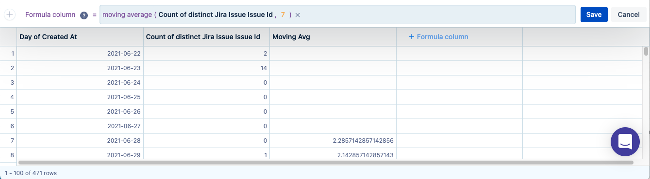Select + Formula column above the “Result table”, select Moving average from the list of guided formulas. For the parameters, choose “Count of distinct Jira Issue Issue Id” as the input column and type 7 for the number of trailing rows to calculate the moving average for the last seven days. Select Save.