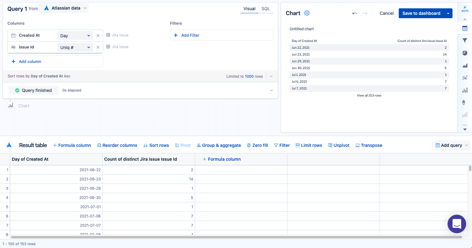 Here we use an Atlassian Data Lake data source and add the “Created At” and “Issue Id” columns from the “Jira Issue” table to our query, keeping the grouping and aggregation as Day and Count of distinct, respectively. Select Run query.