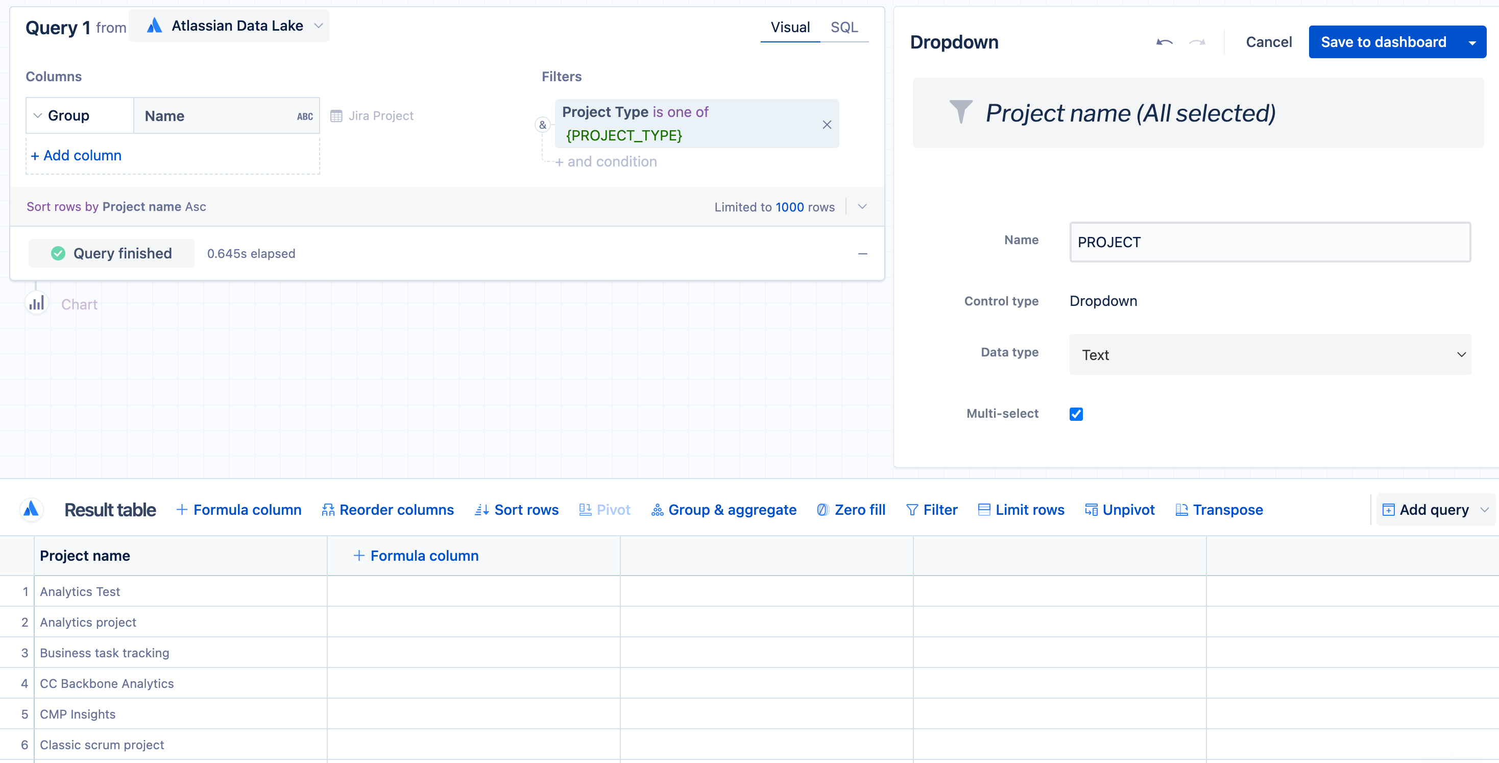 In this example, we used our Atlassian Data Lake data source to create a table chart listing the projects and number of issues created in each project. We want to filter our chart by project name, but this project list is extensive as we have multiple projects from various project types. We’d like to only look at projects from selected project types to compare them in our chart.