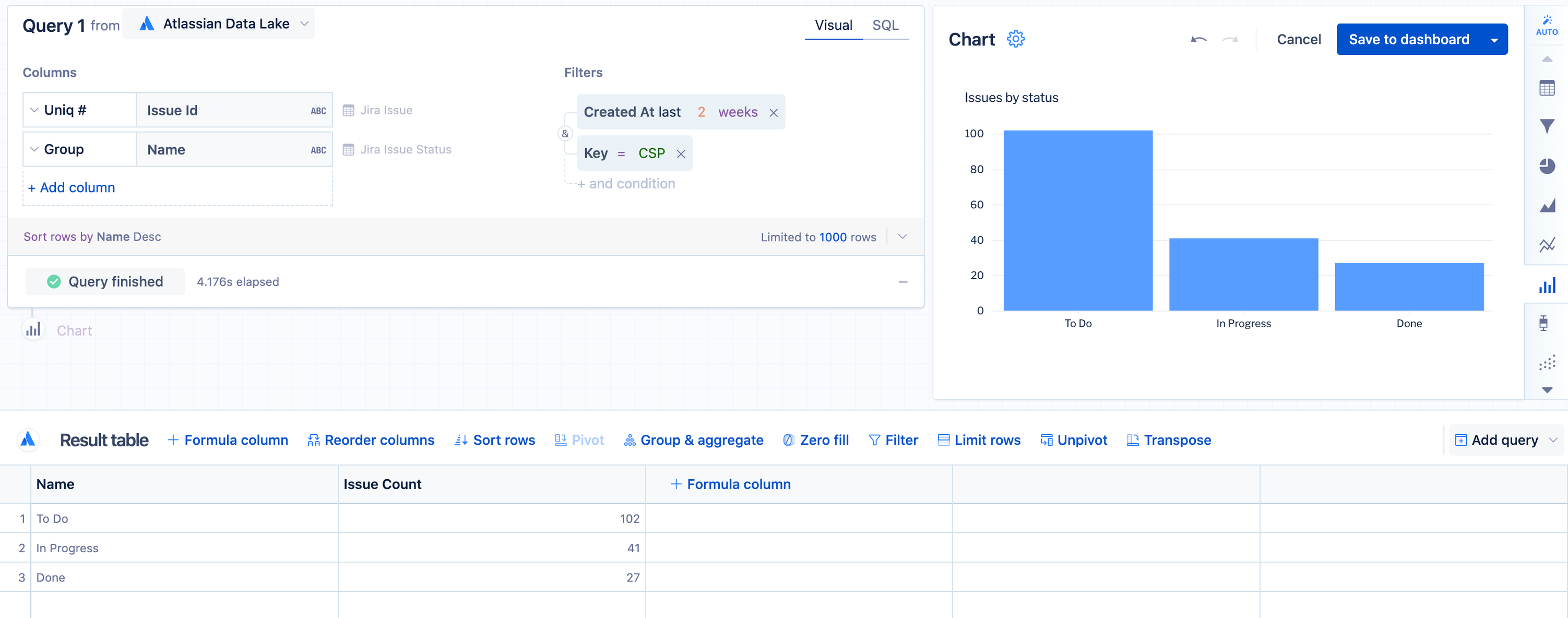 Add the category column to the query again. In this example, we added the “Name” column from the “Jira issue status” table again.