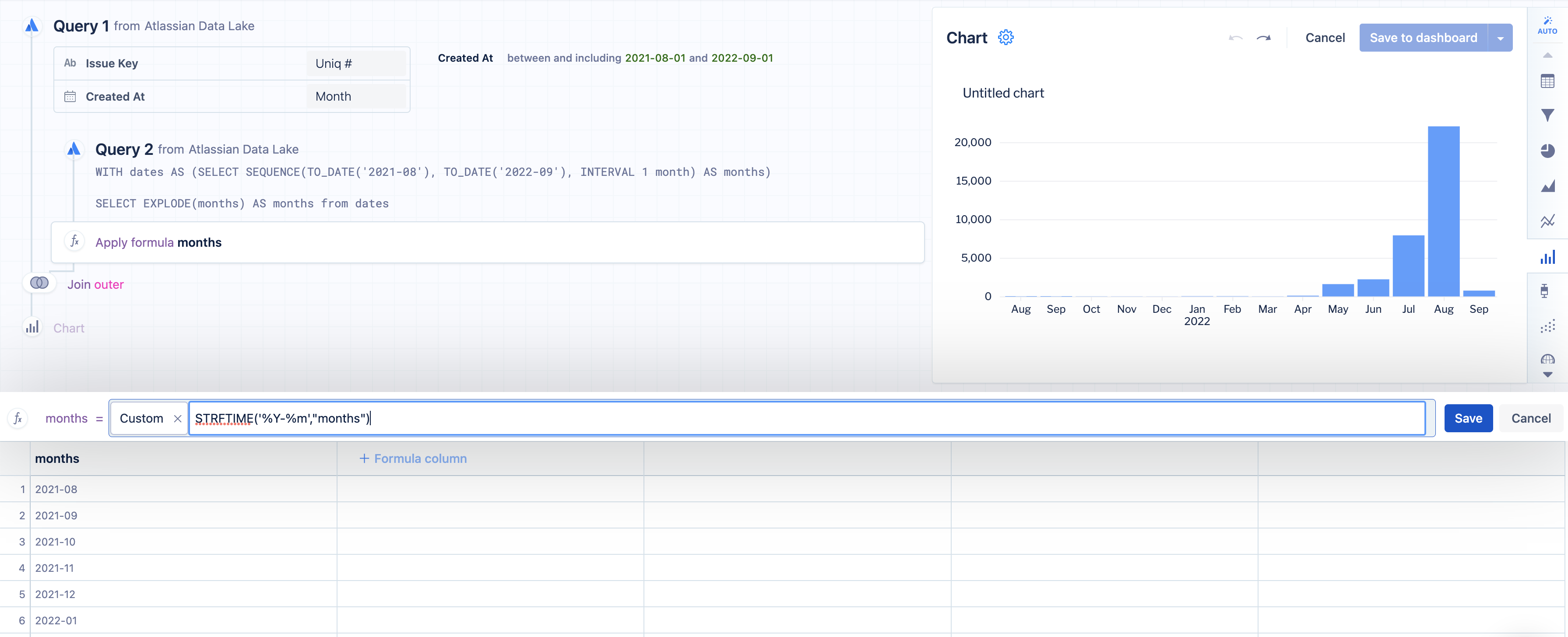 3. Staying on Query 2, use an "Apply formula"step to edit the “months” column. Select Customas the formula type and use the following SQLite formula to format the datetimes: