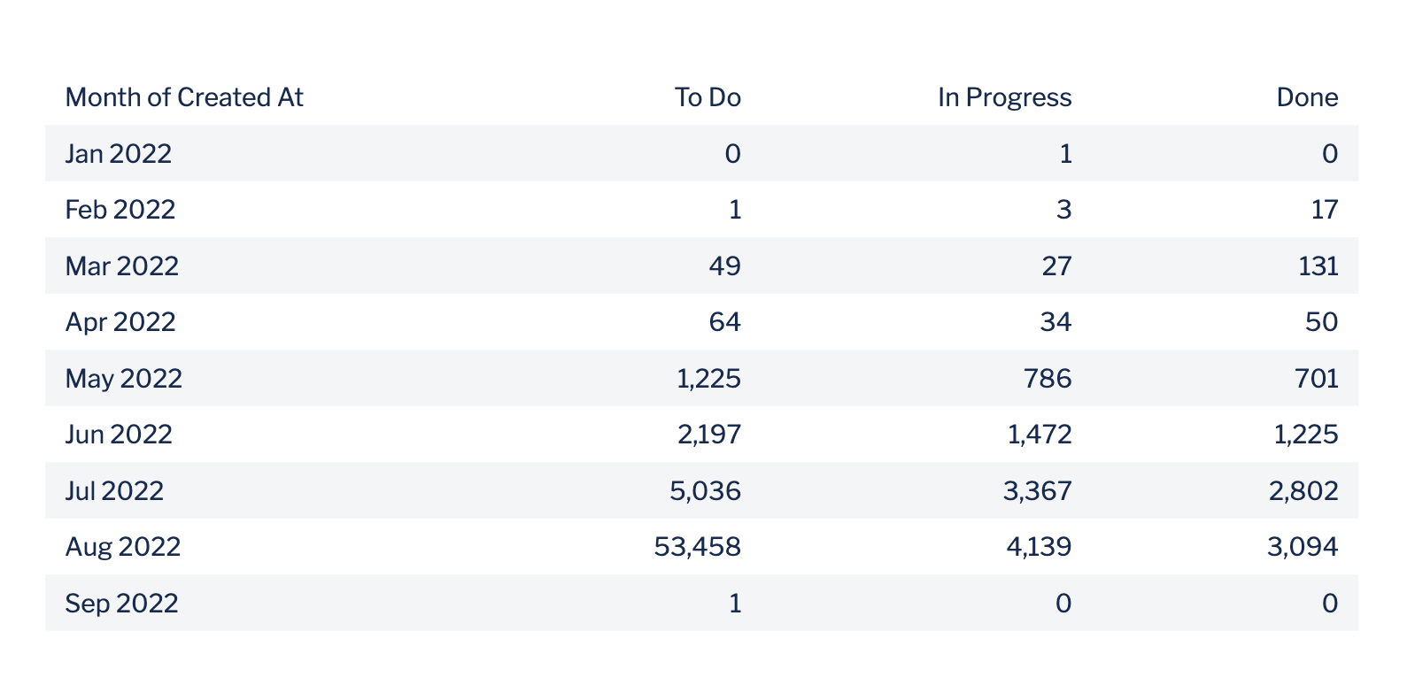 In the example below, we have a table chart with the monthly number of issues within the status of “To Do”, “In Progress”, or “Done”. We want to return only rows where our monthly number of issues in the Done status is higher than our monthly number of issues in the In Progress status. Here’s the chart we’re working with: