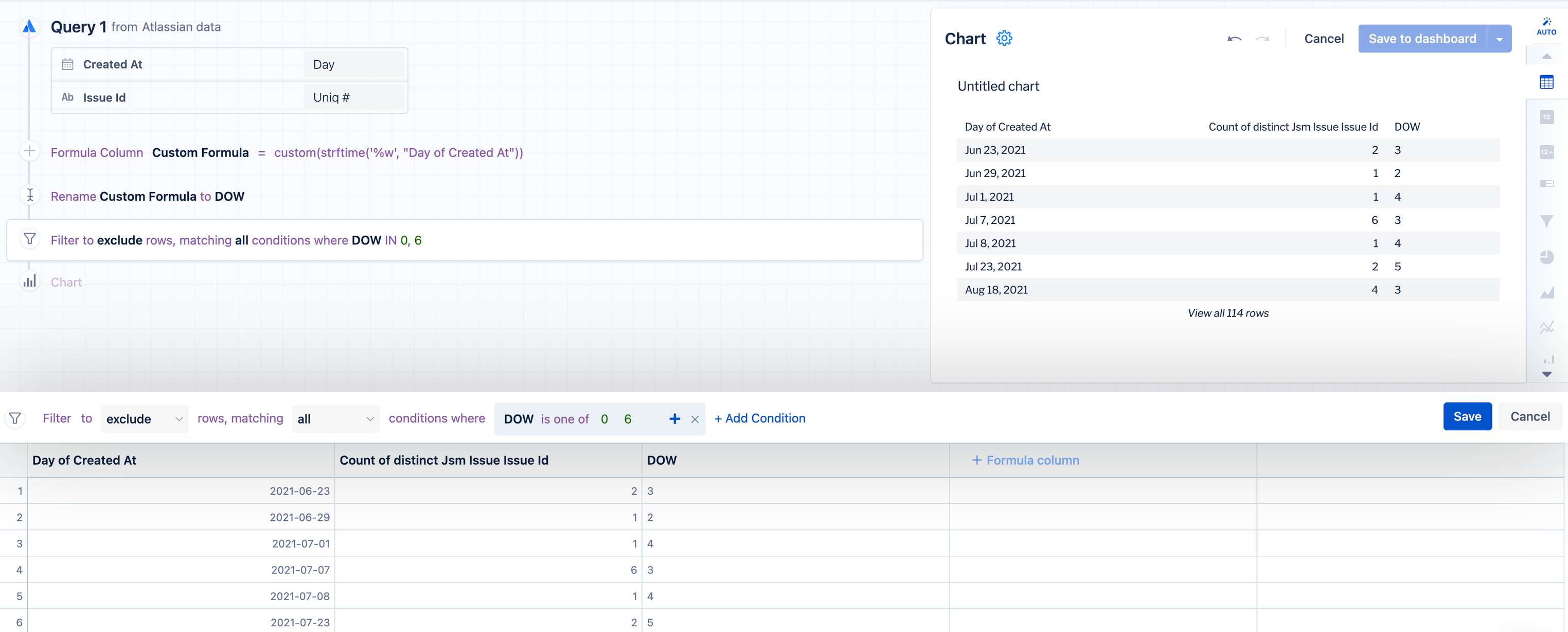 Now we can filter out values 0 and 6 using a “Filter” step to remove any rows where Created At is a weekend. We’ll exclude rows matching all conditions where DOW is one of 0 and 6 as done below: