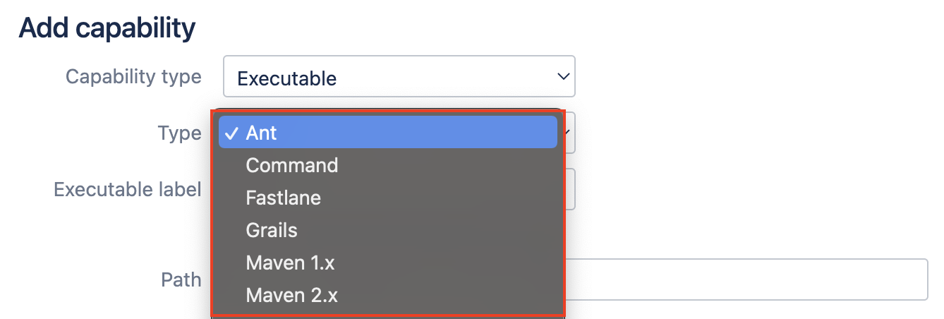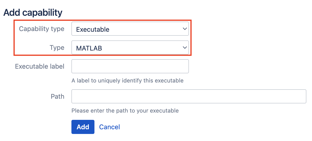 When going to Bamboo administration > Overview > Server capabilities > Add capability, The MATLAB executable type is not listed in the Type drop-down menu: