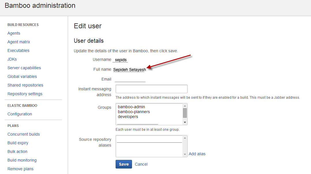 Changes to a user's full name show up correctly under Bamboo's User Management page, AD and JIRA, but when selecting the user it still has the old name under User Details page. Example: User with Username "sepids" has a new last name: "Setafar". Changes to her last name are not reflected correctly under User Details page: