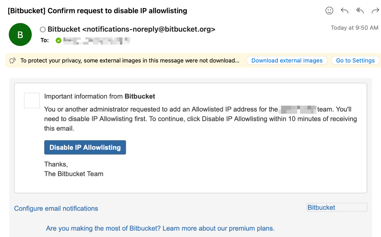 IP allowlisting has a safeguard in place for all workspace administrators. When an administrator attempts to access a workspace outside of the allowlisted IP addresses (For example, they are outside your corporate network or have VPN issues), you'll see the following message on Bitbucket Cloud, indicating you're blocked from the content. Still, you can turn off IP allowlisting to gain access as an admin.