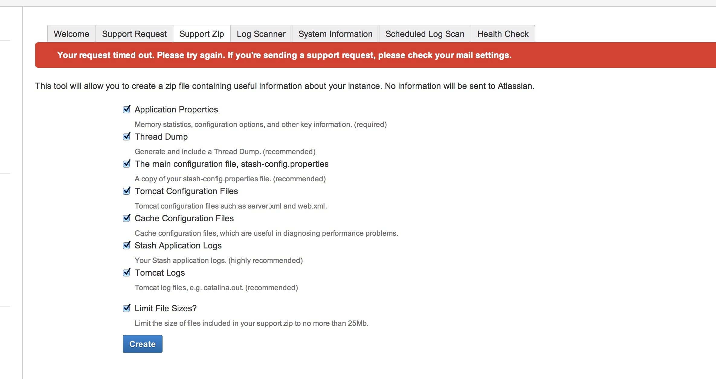 Create support zip fails with timeout message