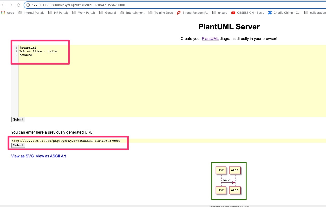 Once you have the PlantUML server check if you can access its web service <<platuml_server_url>>/uml. Here you can write the PlantUML DSL code to generate the diagram. The web service will also provide you the png URL along with the diagram encoding. See below screenshot.