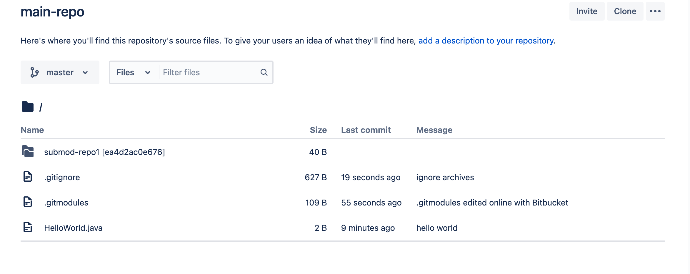 In this sample, we have a repo called main-repo in Bitbucket Cloud (bitbucket.org) that has a submodule called submod-repo1: