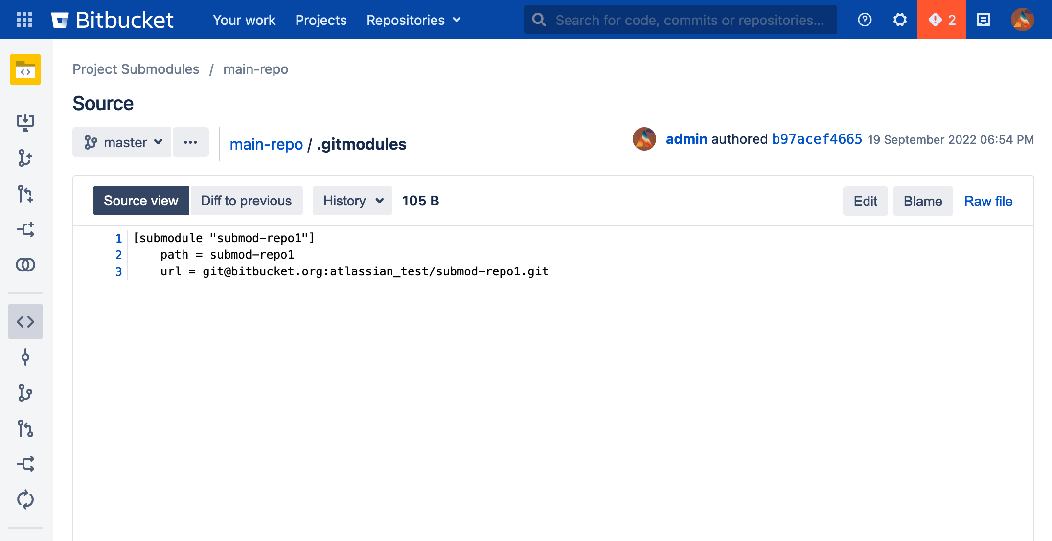 When both the main-repo and submod-repo1 repositories are imported into Bitbucket Server/Data Center, it might be assumed that the URL in the .gitmodules file will be updated to reflect Bitbucket Server's base URL.