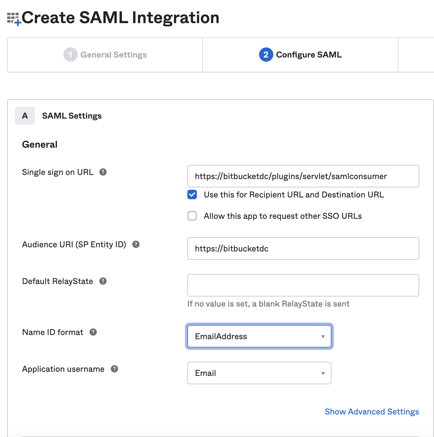 Configure SAML SSO settings for Bitbucket that are provided from OKTA