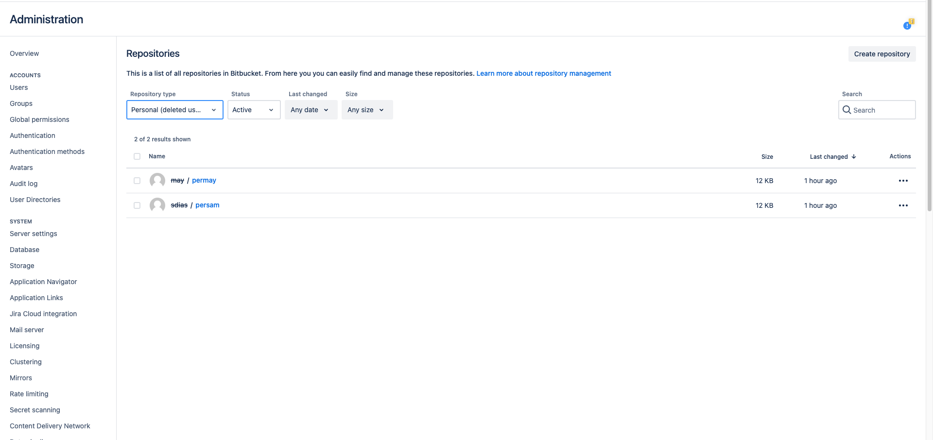 In addition, there's a feature that allows System Administrators to easily view orphaned repositories, left by deleted users. In Bitbucket Server 7.13 we have released Advanced repository management. This feature helps to get a holistic view on all repositories in Bitbucket. It can help you find all orphaned repositories in just a few clicks. Select Personal (deleted users) option in Repositories type filter :