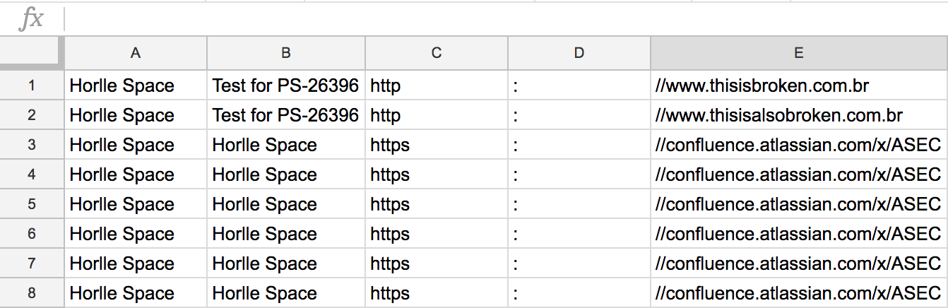 Linksin Confluence database that stores such data, which makes finding the links a matter of running the right query. That being said, execute the query below in your database to get a report with Space Name, Page and Link for each of the space pages:SELECT s.spacename as Space, c.title as Page, l.destspacekey as SpaceOrProtocol, l.destpagetitle as Destination FROM LINKS l JOIN CONTENT c ON c.contentid = l.contentid JOIN SPACES s ON s.spaceid = c.spaceid WHERE c.prevver IS NULL and s.spacekey = 'YOUR_SPACE_KEY_HERE' ORDER BY l.destspacekeyWith these results in hands, export them to Excel. Once exported, they should look like this: