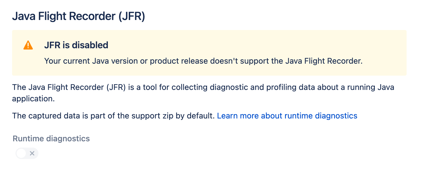 When browsing to General Configuration > Troubleshooting and support tools > Diagnostic settings, Confluence shows the following warning message in the Java Flight Recording (JFR) section: