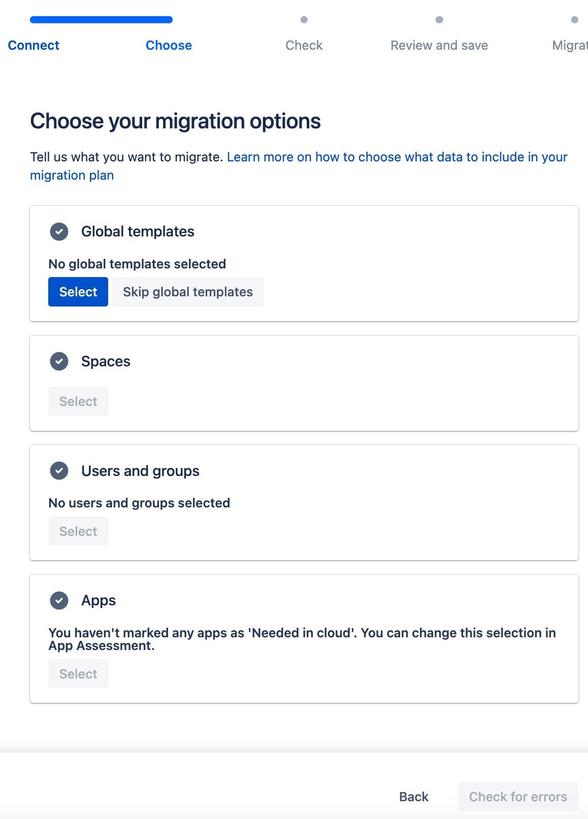 5. On the Choose your migration options screen, select the data to include in your migration; you can add the following items: