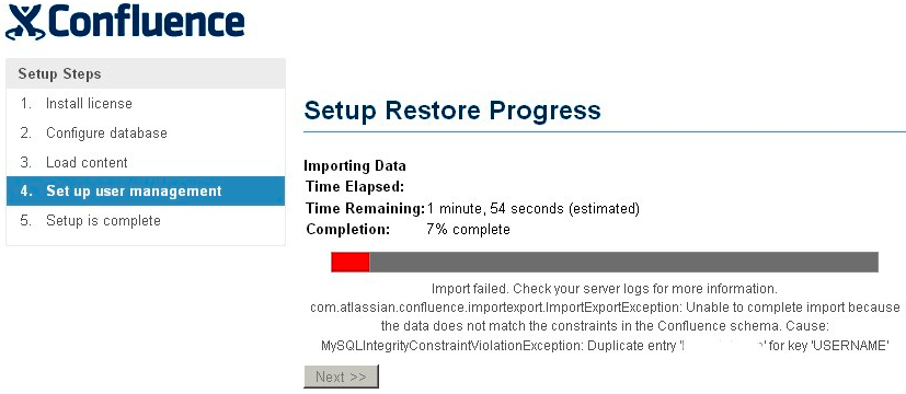 com.atlassian.confluence.importexport.ImportExportException: Unable to complete import because the data does not match the constraints in the Confluence schema. Cause: MySQLIntegrityConstraintViolationException: Duplicate entry 'admin' for key 'USERNAME'