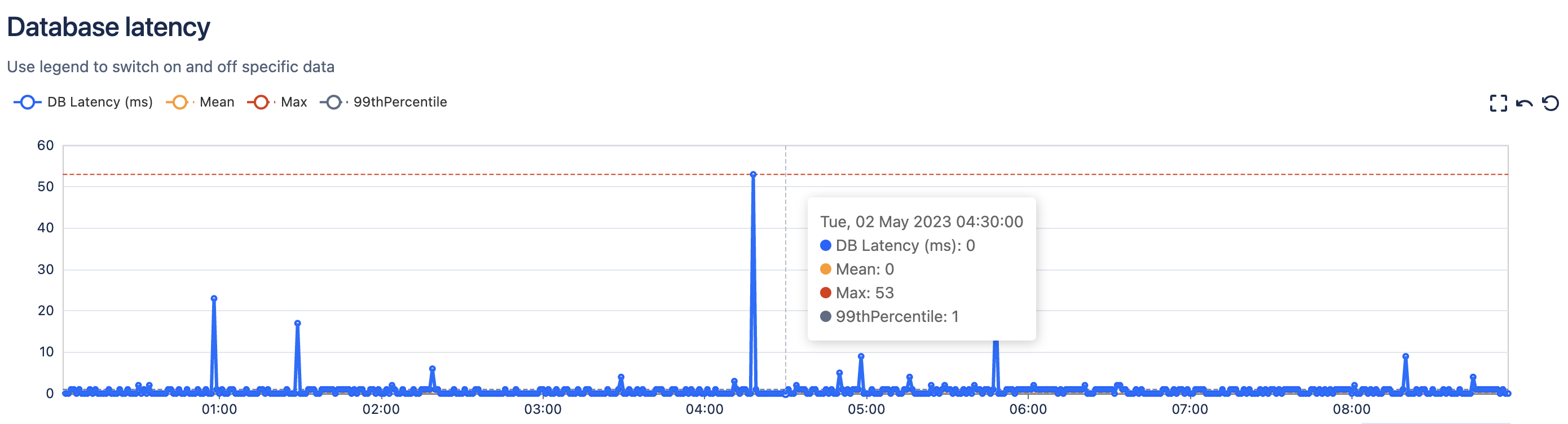 Here’s a sample plot showing a time series of database latency measurements in milliseconds (ms), overlaid with Mean, Max, and 99th Percentile for the time period. The values are generally below 5 ms with occasional, irregular spikes of between 10-60 ms.