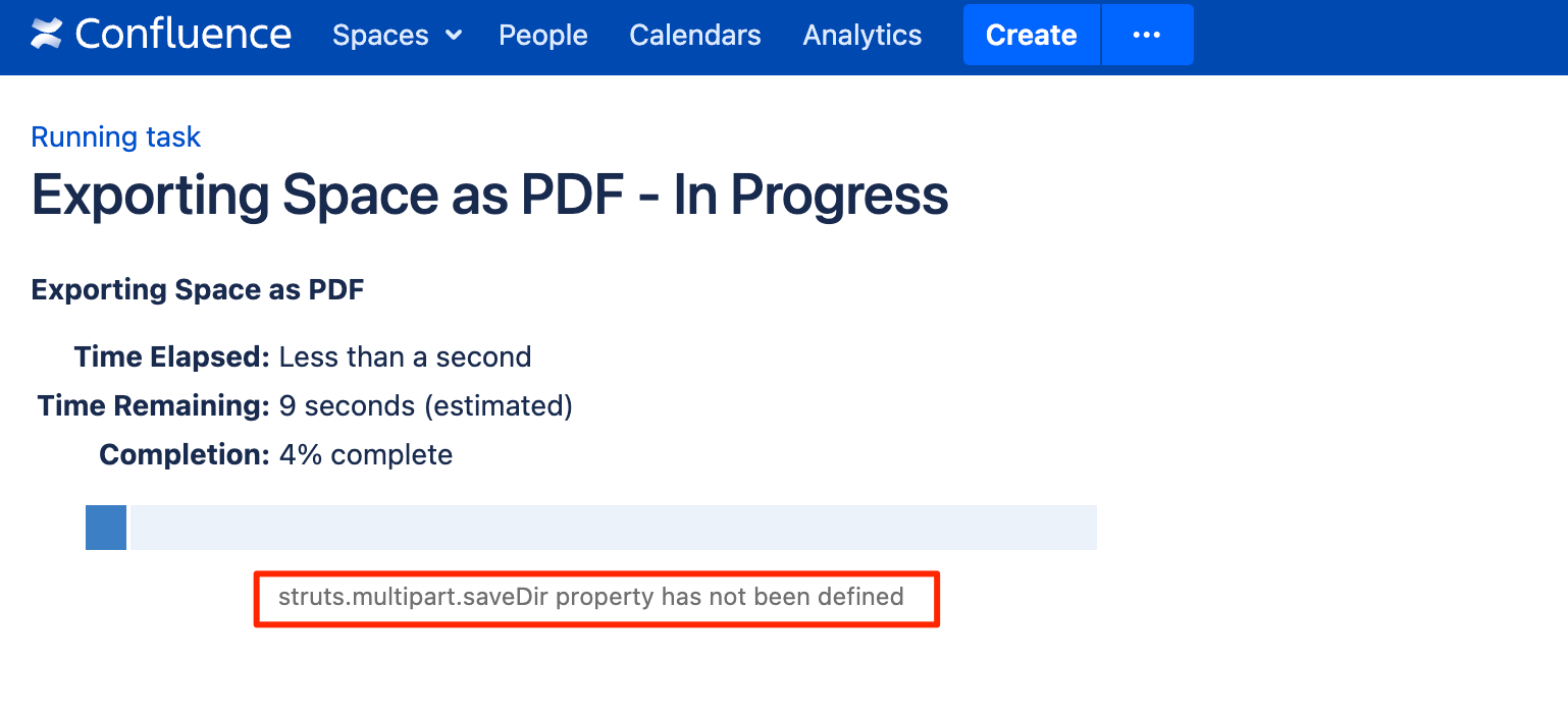 Depending on the situation (exporting an individual page or a space), the following error will be observed in the Confluence UI: