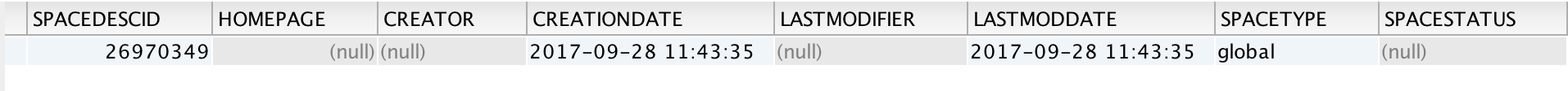 select * from SPACES where SPACEKEY = 'test';Take a note of the spaceid from the previous query and use it to update spacestatus to 'CURRENT' status
