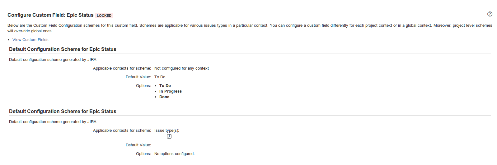 This issue could be caused by the Epic Status. For example, there are two default Configuration schemes for the Epic Status field, and both of them contain an incomplete default configuration.