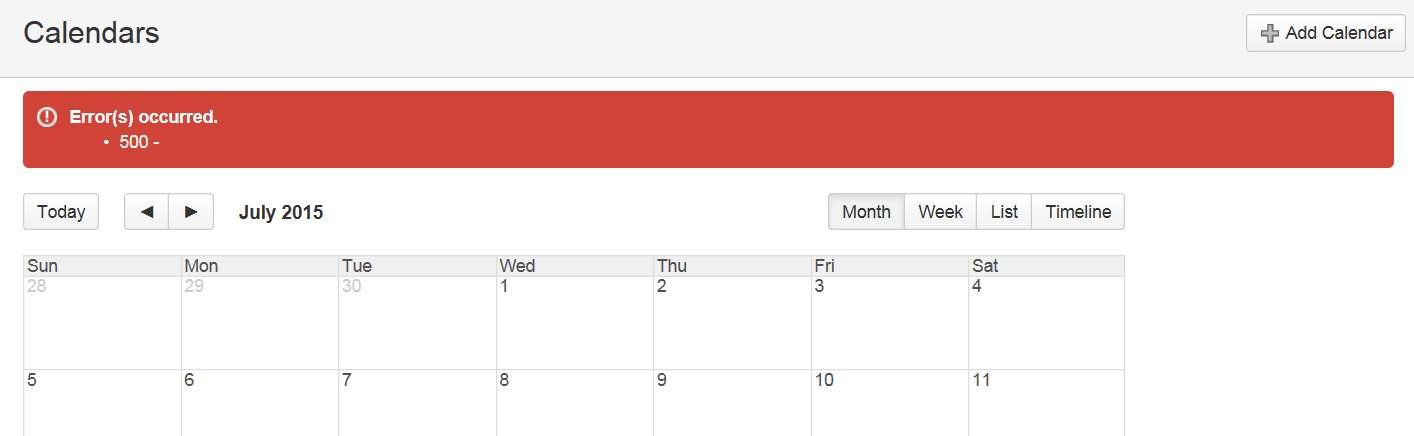 When attempting to view Team Calendars for Confluence, users receive a 500 error as shown below: