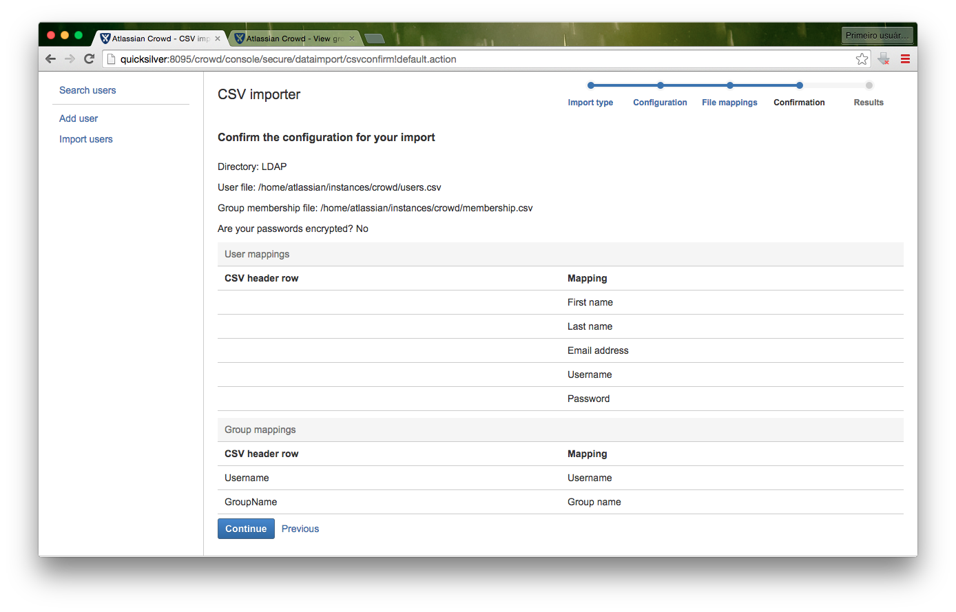 Then select the directory your users and group belong to. If it's an LDAP, you'll need to select No for passwords encrypted. Then specify the whole path of the users.csv and for the membership.csv files and click on Continue.