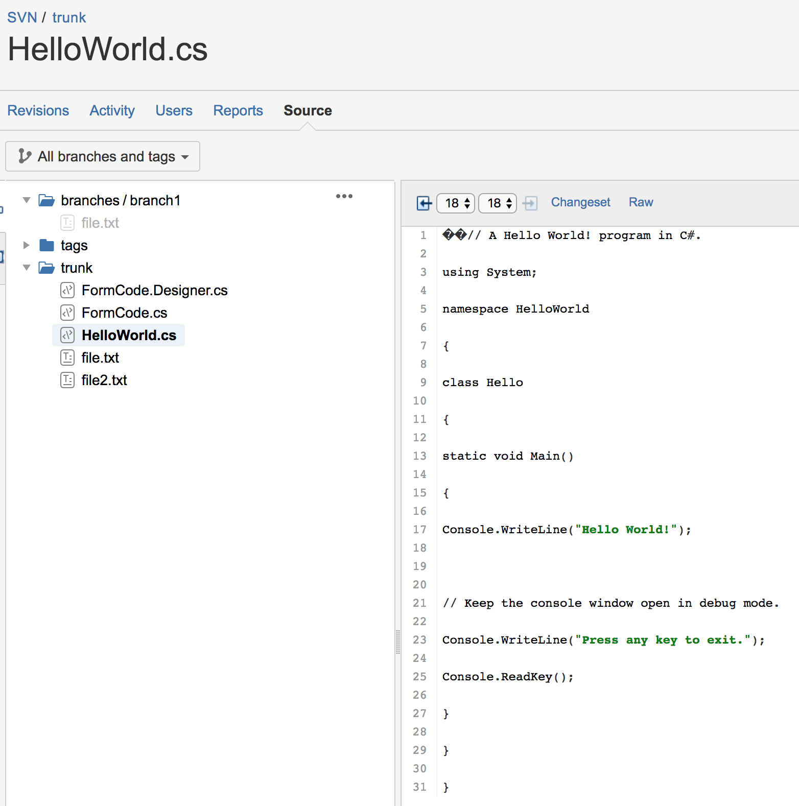 Navigate to their source code, by opening http://localhost:8060/browse/SVN/trunk/HelloWorld.cs?r=18.