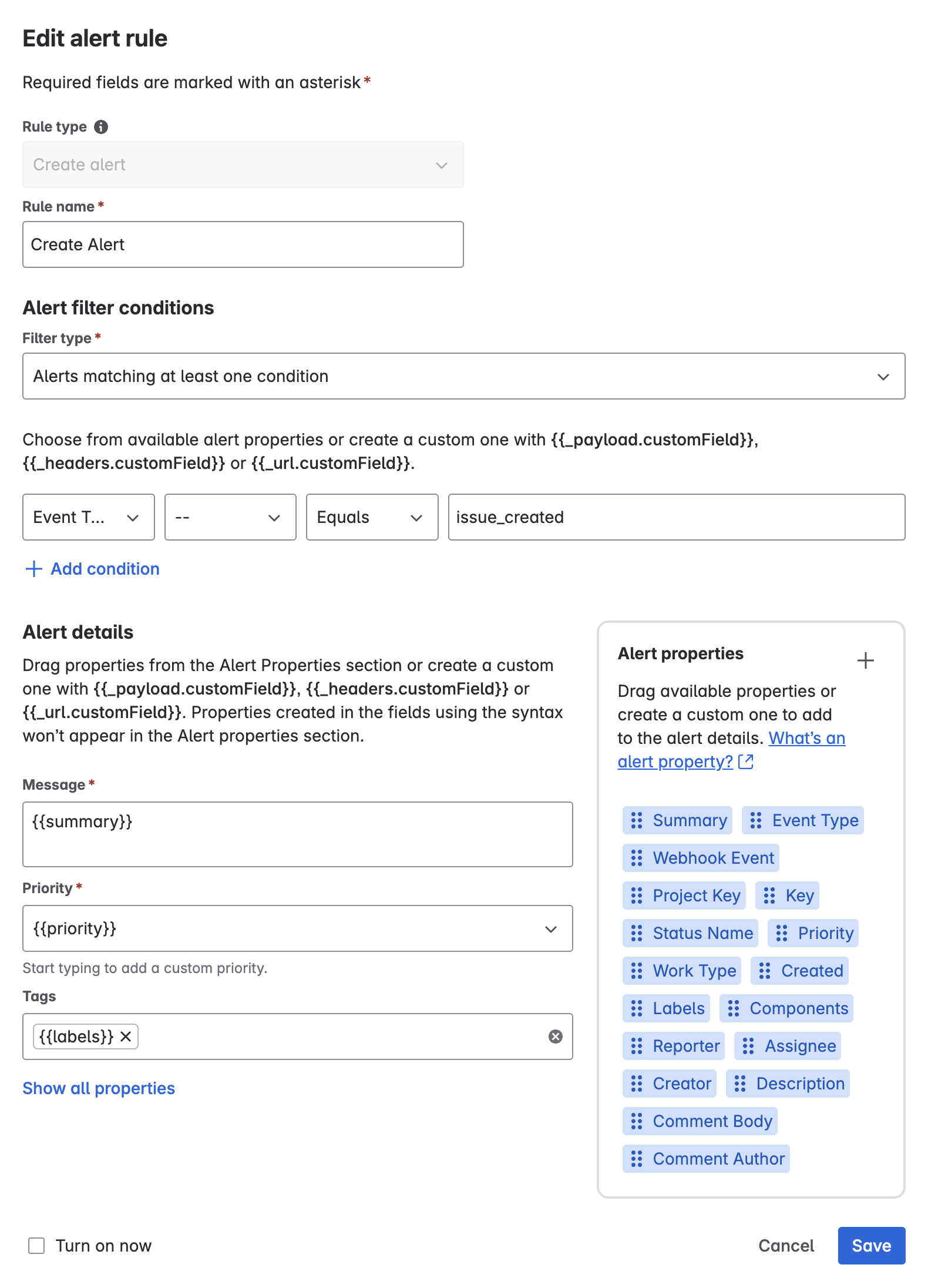 Jira Service Management interprets the expressions within the double-curly braces as custom alert properties. Custom data populates at every notification that's sent to Jira Service Management. For example, someone creates a work item in Jira and enters "This is the summary" for the summary. Using Jira Service Management’s Jira integration, "[Jira] {{summary}}" for Message in a ‘Create alert' Action creates an alert with the message "[Jira] This is the summary". It will then notify the users. All we needed to do is drag {{summary}} to the message. When the work item is created, Jira Service Management gets notified automatically. It creates an alert with the work item’s summary in the message.