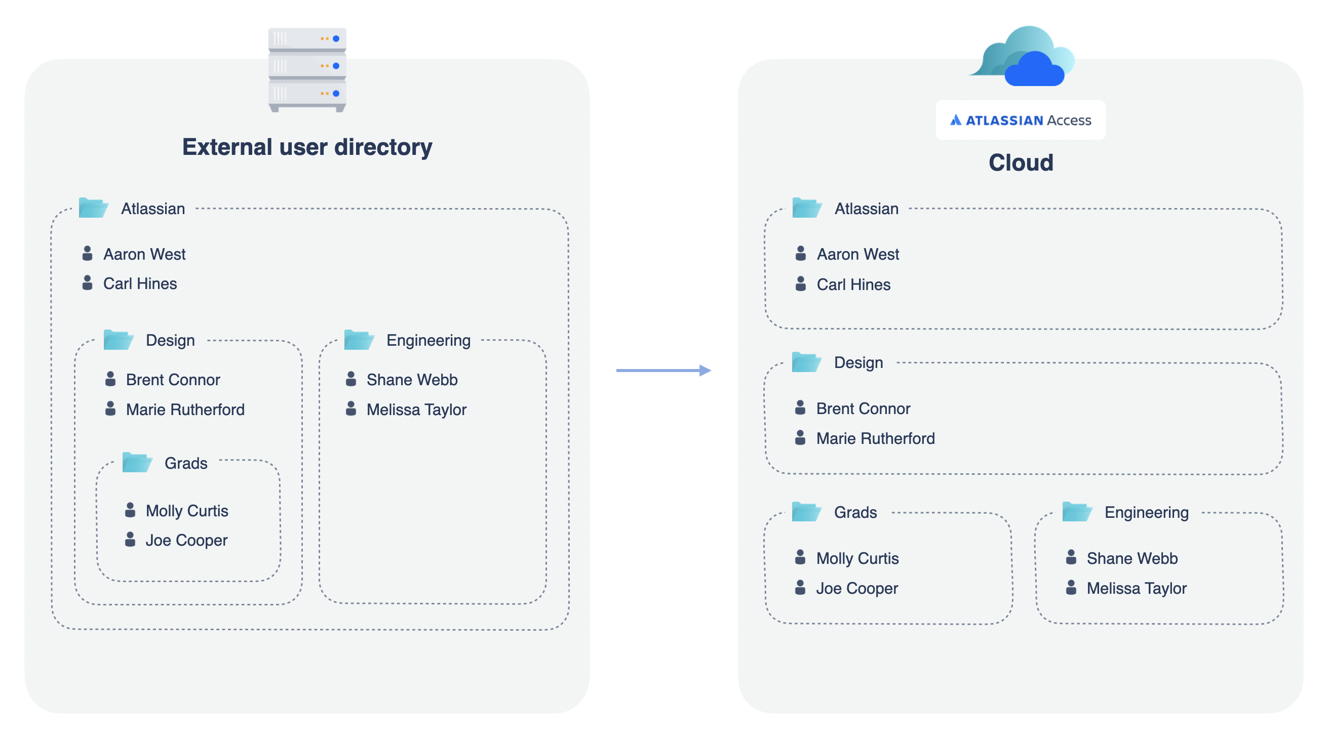 このページでは、入れ子グループを Atlassian Cloud に移行する場合に関連する問題と、そうした問題を回避する方法について概説します。要約すると、入れ子グループは Atlassian Cloud ではサポートされていませんが、入れ子構造を外部ユーザー ディレクトリに保持してフラット化されたものを Cloud で使用できます。
