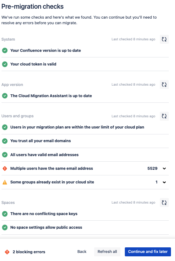 エラーをチェックし、確認して Confluence 移行を実行する