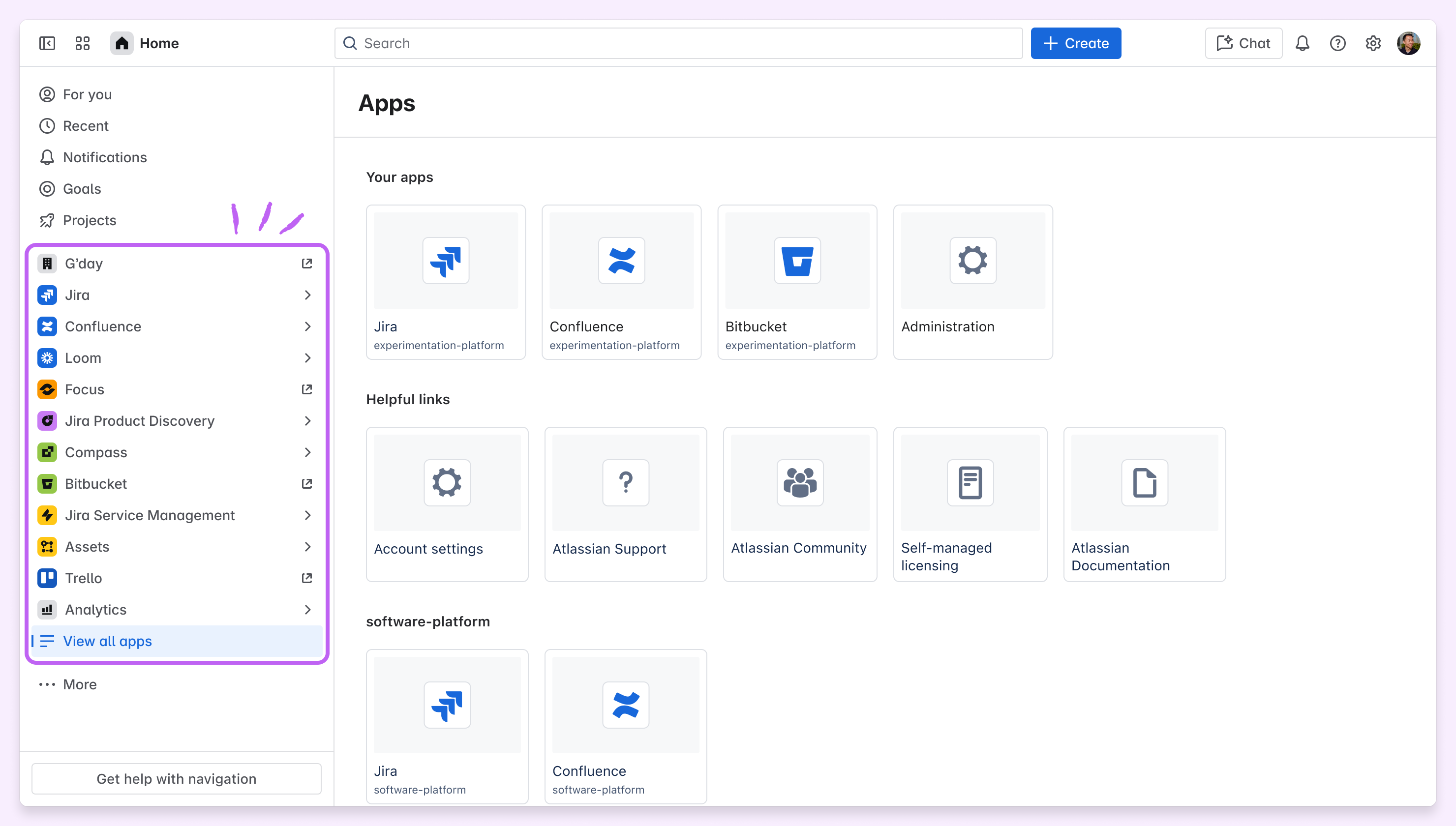 新しいナビゲーションでは、主にカスタマイズ機能と使いやすさの改善を行いました。最終的にすべての Atlassian アプリに適合するように、ソフトウェア アプリのユーザーになじみのあるデザインで、新しいナビゲーションを作成しています。