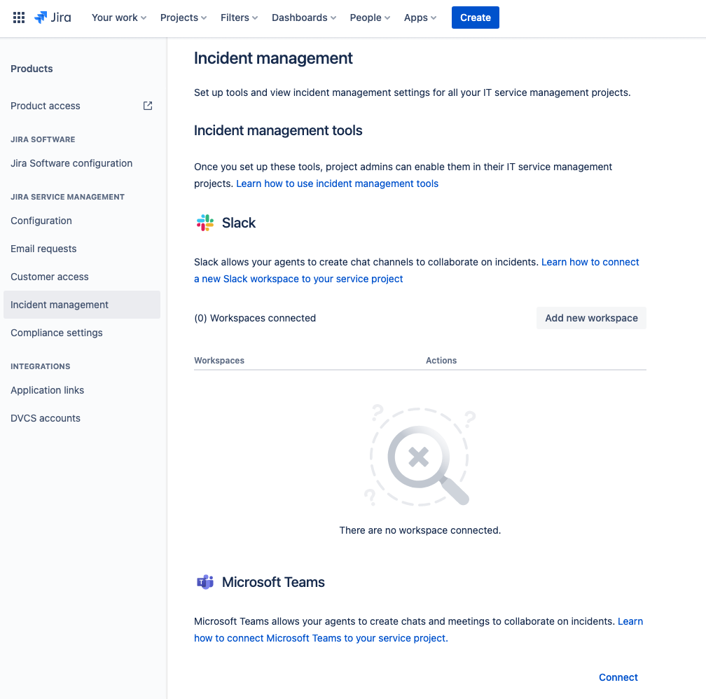 Microsoft Teams is a chat and video-conferencing tool that you can connect to Jira Service Management to make it easy for incident responders to communicate, collaborate, and resolve incidents. It’s supported in IT service management projects for which the Incidents work category is enabled. Learn how to add a work category to your service projects.