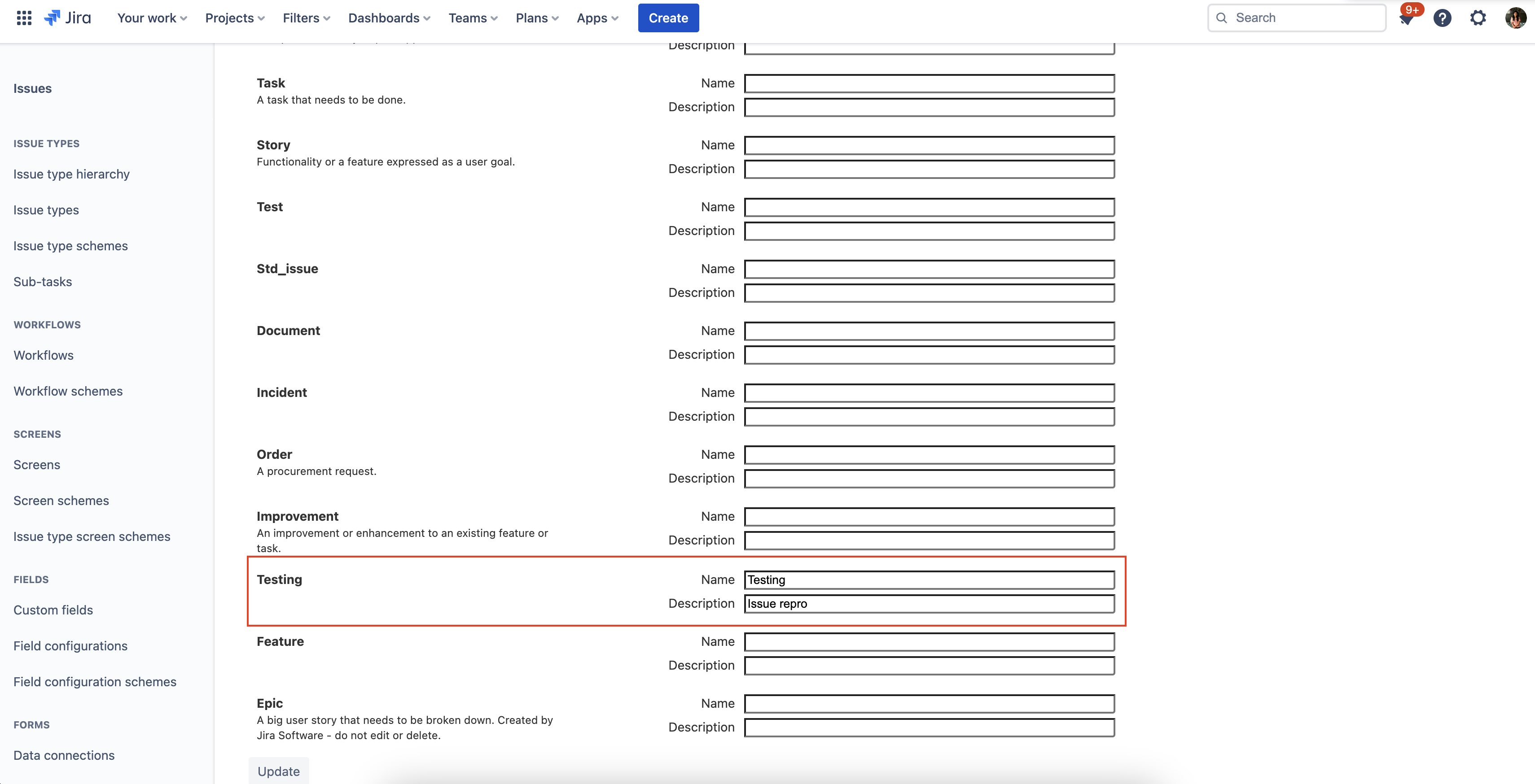 Rename an existing issue type. For example, rename the "Testing" issue type to "New testing"