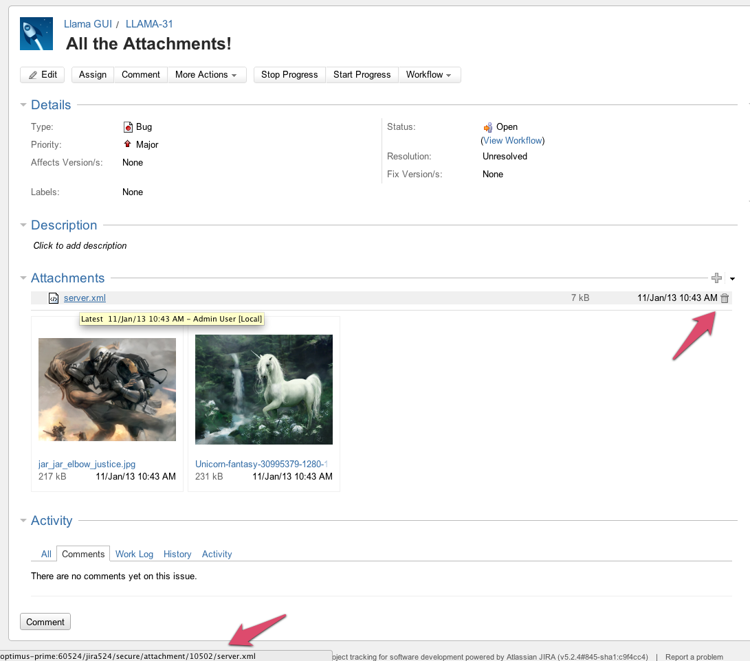 server.xmlas it has the id 10502.10500;"jar_jar_elbow_justice.jpg" 10501;"Unicorn-fantasy-30995379-1280-1024.jpg" 10502;"server.xml"Delete the attachment using the trashcan icon on the View Issue screen.