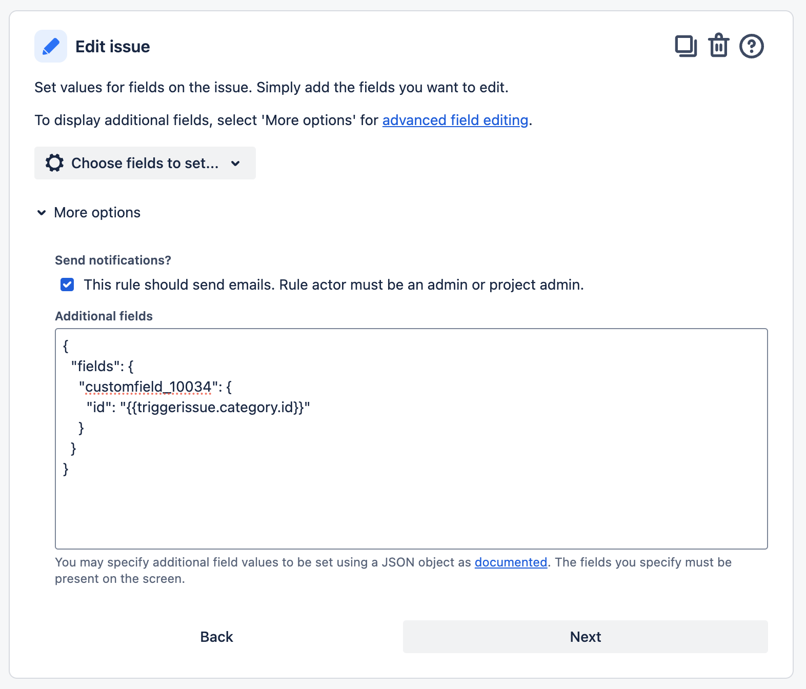 In this example, we will use the "id" property to copy the Category field from the trigger issue: