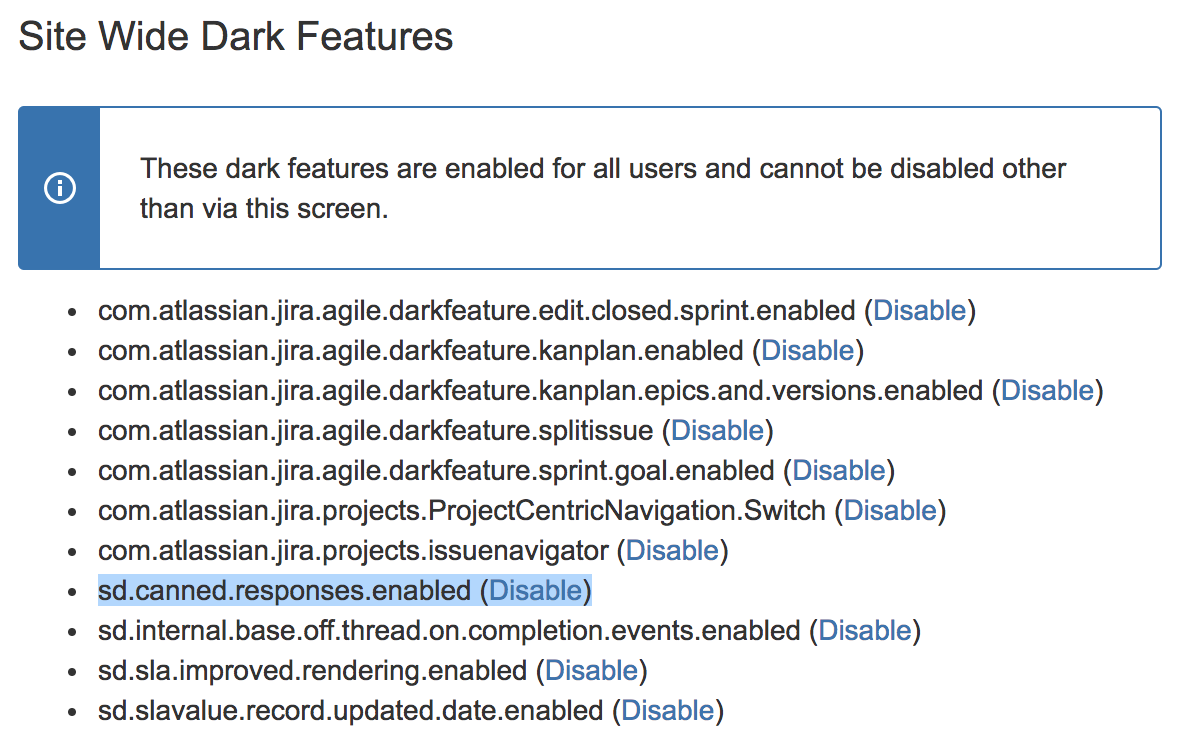 If the feature is missing, add it by entering sd.canned.responses.enabled in the Enable dark feature box and clicking on the Add button, as shown below: