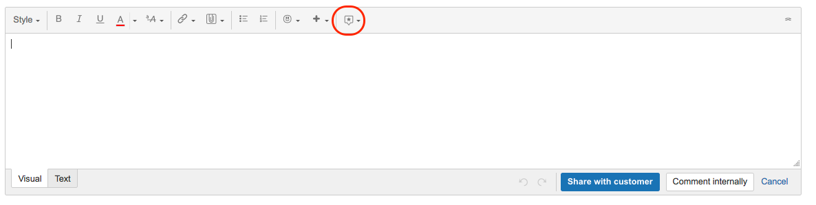 When trying to comment on a Service Desk issue, the canned response button is missing from the top menu of the comment field: