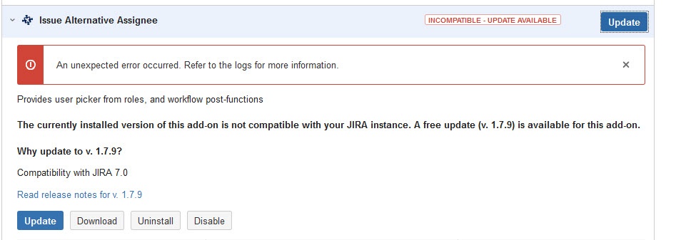 Cannot update plugin. An unexpected error occured. Refer to logs for more information