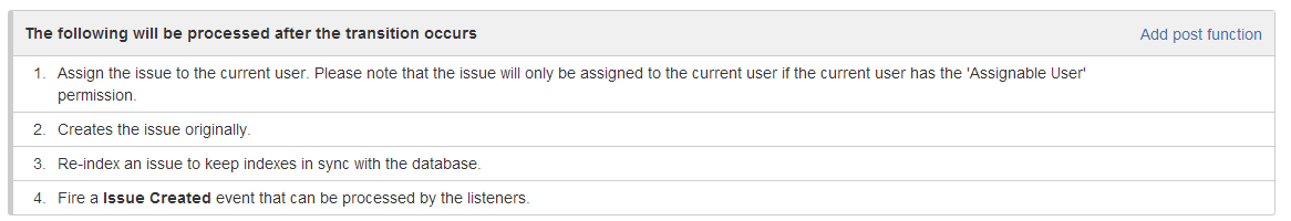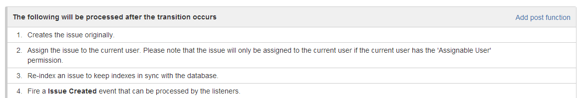 Any post functions placed after the "Creates issue originally" function will not have updates to the issue persisted to the database.