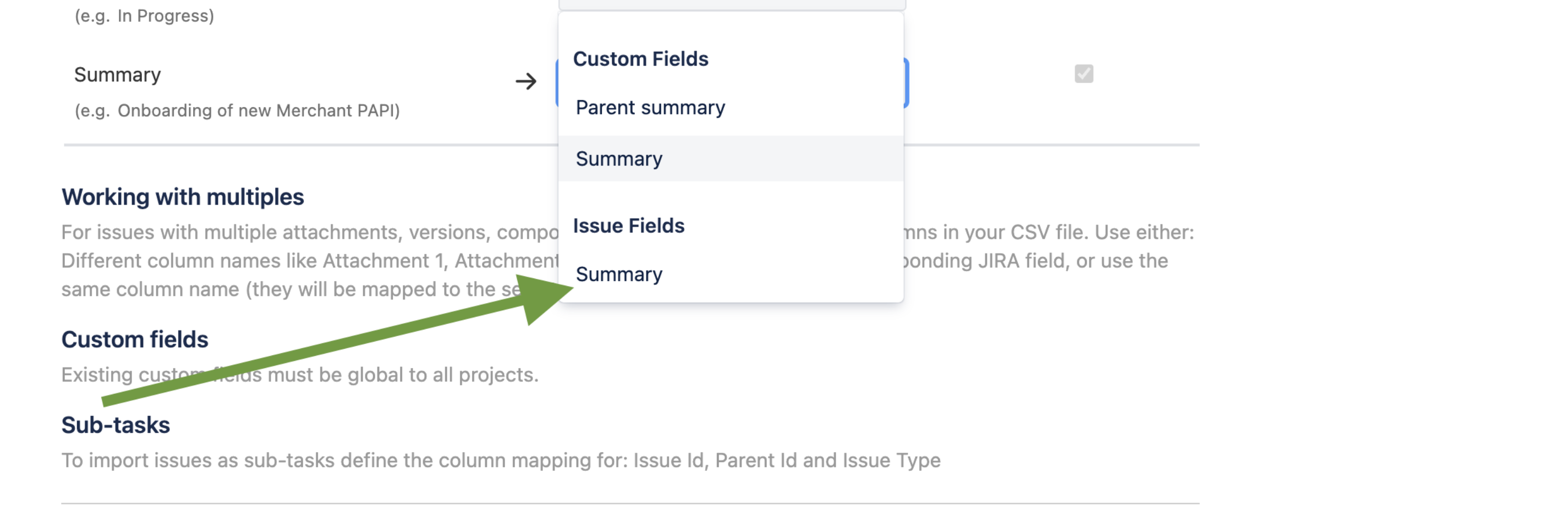 A custom field name "Summary" exists on the site which may cause confusion while selecting the system field "Summary" in the Mapping field screen during import.