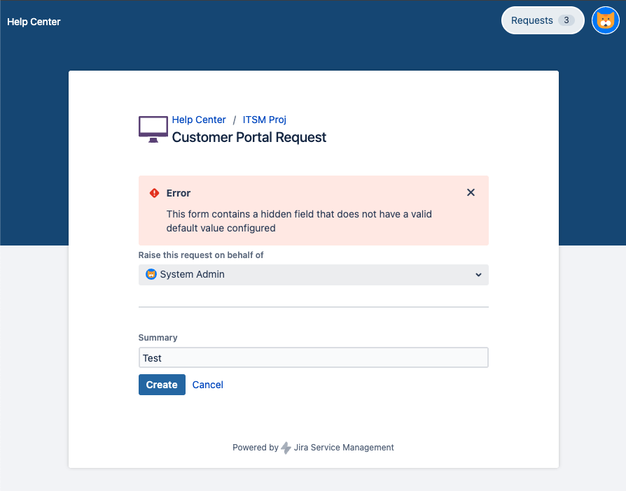 When attempting to create a new request on the customer portal (JSM), the user receives the error message “This form contains a hidden field that does not have a valid default value configured”.