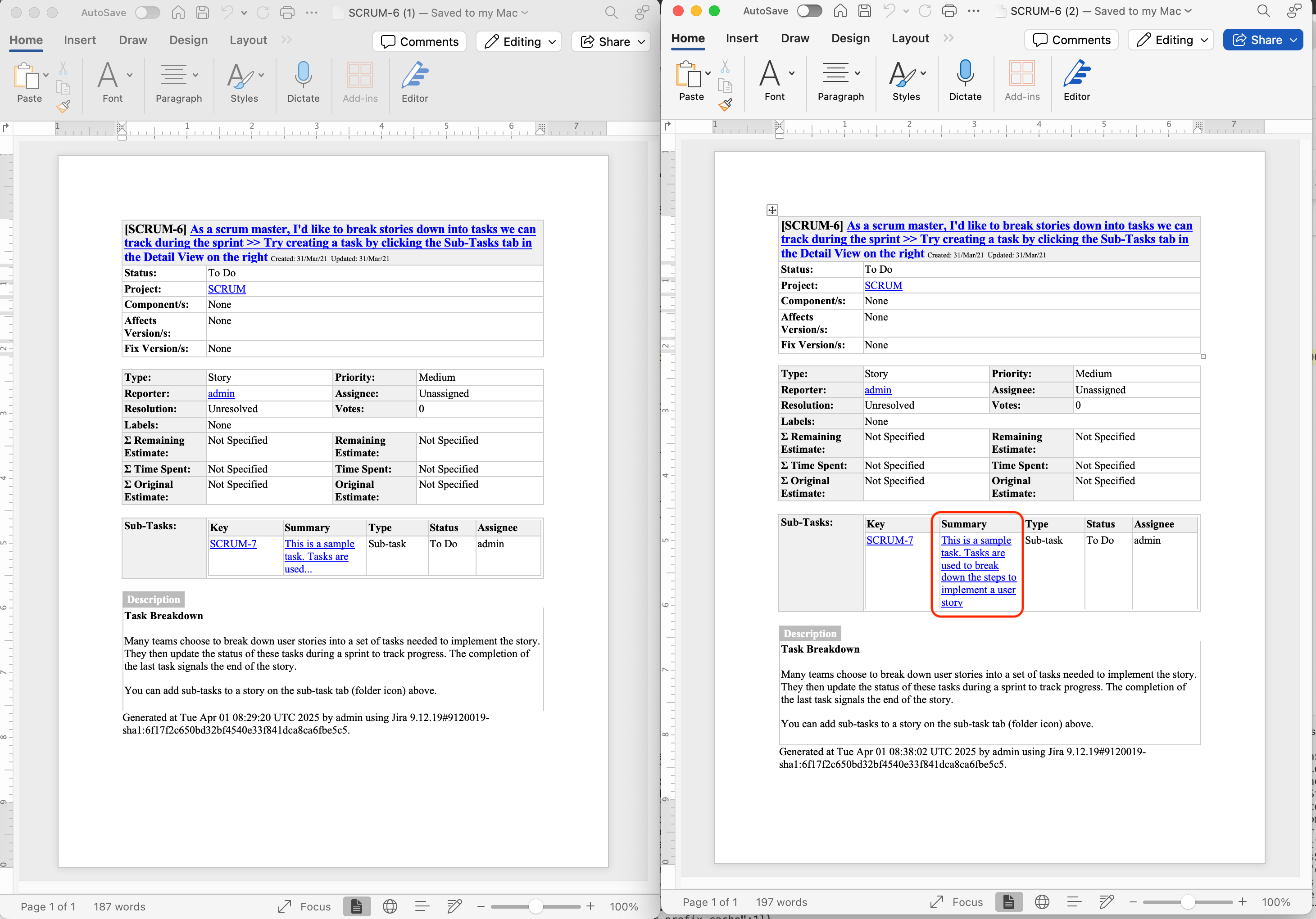 <!-- Line 367 --> <a href="$baseurl/browse/$textutils.htmlEncode($encoder.encode($subTask.key))">$textutils.htmlEncode($stringUtils.abbreviate($subTask.summary, 100))</a>You will see more chars from the Summary is added to the Word file. Please see screenshot of Word file export before and after changes applied.