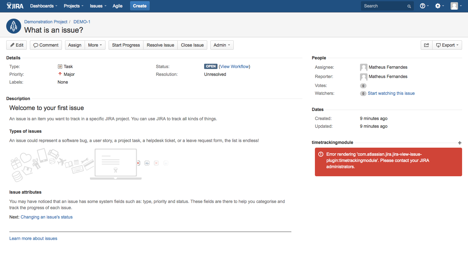 2015-01-26 15:09:11,209 http-bio-8014-exec-21 ERROR matheus 909x54x1 1fg0cr8 192.168.10.239 /browse/DEMO-1 [jira.web.component.ModuleWebComponentImpl] An exception occured while rendering the web panel: com.atlassian.jira.jira-view-issue-plugin:timetrackingmodule (null)