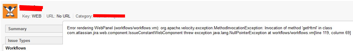 Error rendering WebPanel (workflows/workflows.vm): org.apache.velocity.exception.MethodInvocationException: Invocation of method 'getHtml' in class com.atlassian.jira.web.component.IssueConstantWebComponent threw exception java.lang.NullPointerException at workflows/workflows.vm[line 119, column 69]or