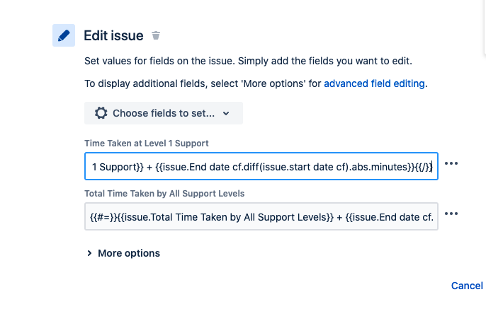 {{#=}}{{issue.Total Time Taken by All Support Levels}} + {{issue.End date cf.diff(issue.Start date cf).abs.minutes}}{{/}}The time difference is calculated using the status entry time and status exit time. To find the status that the issue was transitioned from, the following smart expression is used
