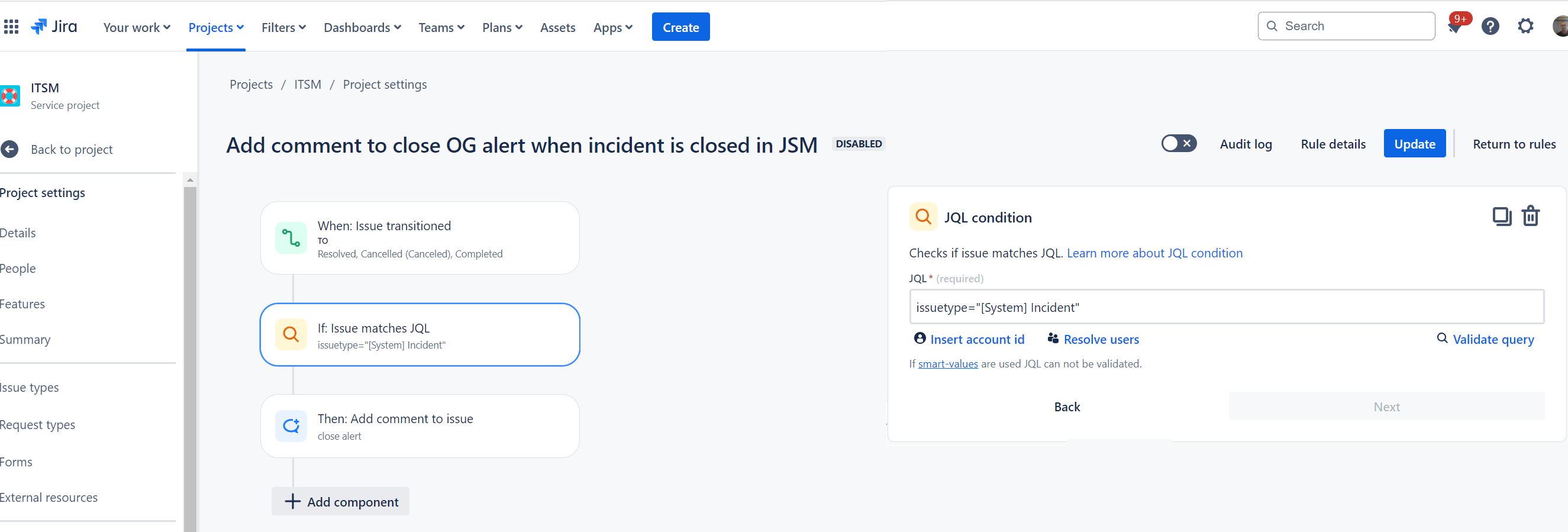 Please follow the steps below to build the solution. In the following example, the rule is being applied to Incident issue-type issues raised by creating an alert in Opsgenie.