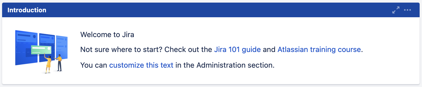 Jira's default/system dashboard includes the Introduction Gadget – a customizable text gadget intended to welcome users to your organization's Jira site.