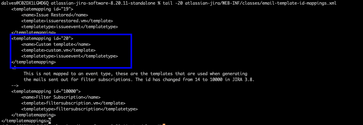 atlassian-jira/WEB-INF/classes/email-template-id-mappings.xml adding the created templates tomake them valid choices for when you are adding a new event.Restart Jira